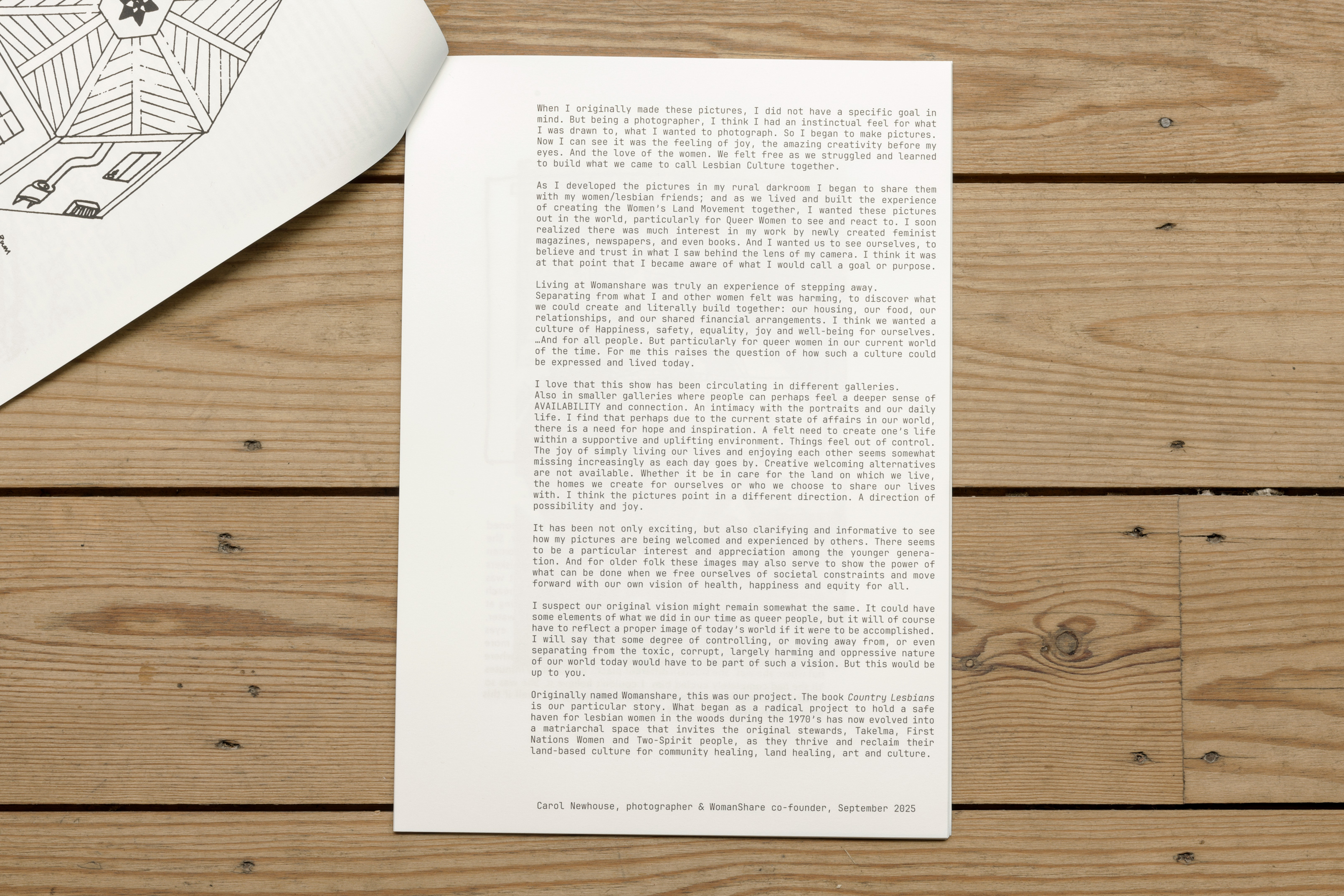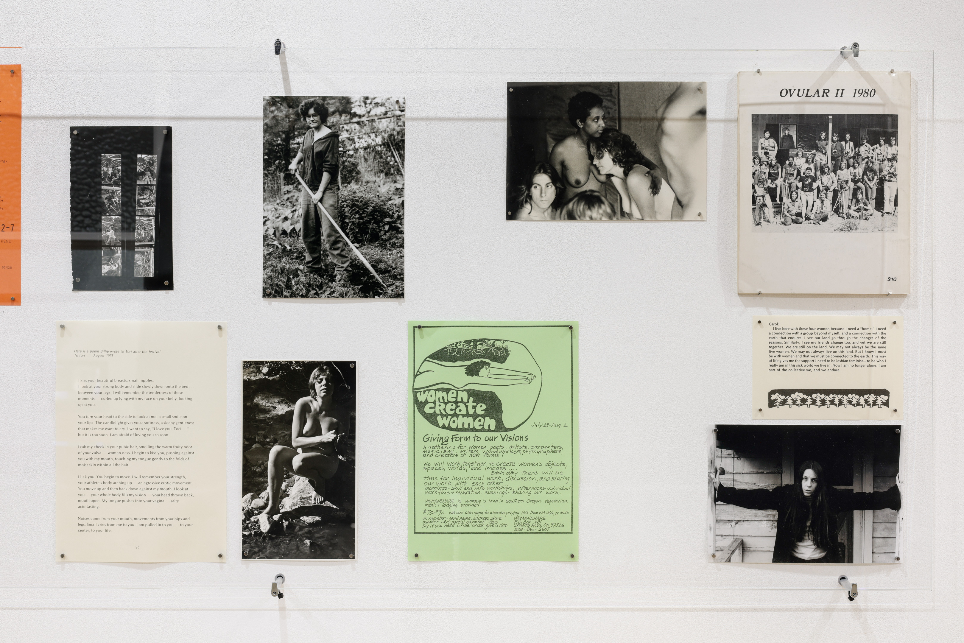 In the summer of 1973, Billie, Carol and Dian, looking to escape the masculine and patriarchal culture of the big city, went on a road trip. Drawn by a desire to return to the land and the conviction that women must find new ways of living together, they left Montreal and headed west, crossing the United States by car until they reached southern Oregon. The independence and isolation they found in rural life allowed them to assert themselves as feminists and lesbians: “Not back to the land, but back to ourselves.” In 1974, they bought their parcel of land and founded WomanShare, a separatist community where they independently lived, built, grew crops and wrote. Taking its title from a book co-written in 1976 by the members of WomanShare, the exhibition Country Lesbians: The story of the Womanshare Collective retraces this herstory. Through archival images, period flyers and magazines, snapshots of intimate moments, and artistic experiments, the exhibition revisits the exploration of new, collective ways of life that animated the 1960s and 1970s, while taking us into the heart of a collective and feminist practice.